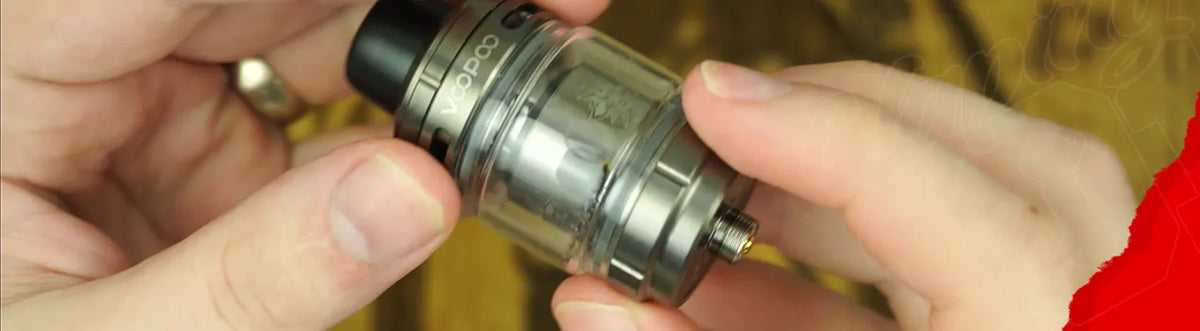 Airflow channels run down through the tank body and up through the coil housing, so each intake path goes directly through the coil. The result is a straightforward and efficient airflow design. The tank uses a top-airflow configuration, which improves leak resistance but carries the characteristic high-pitched whistle some top-airflow tanks produce.