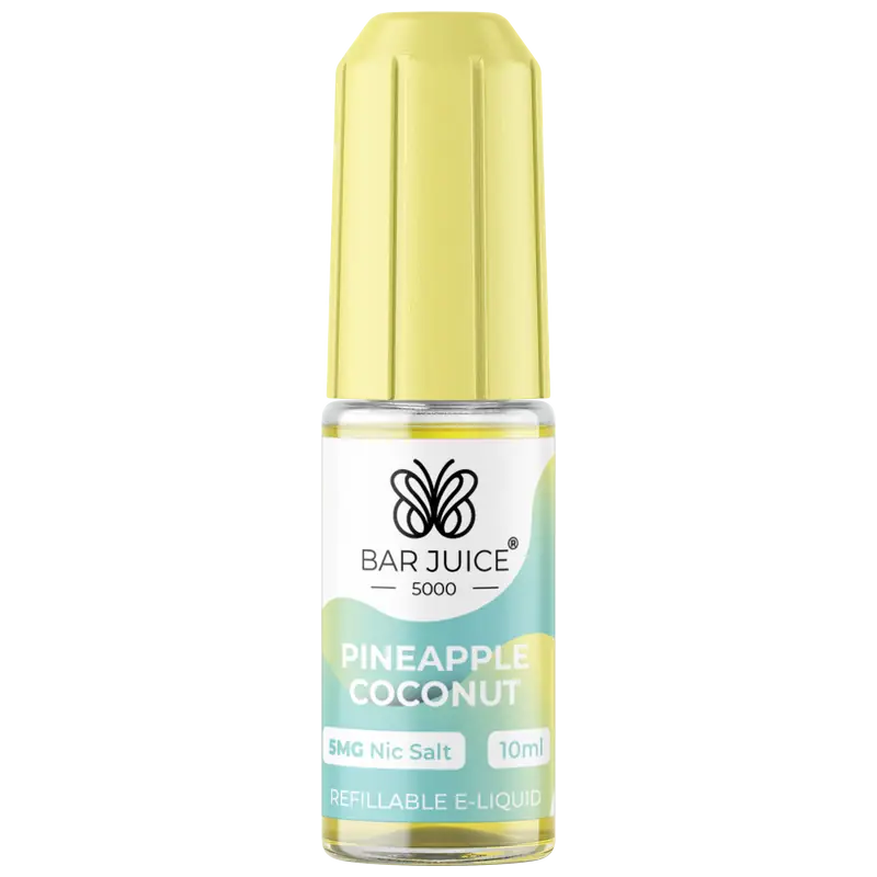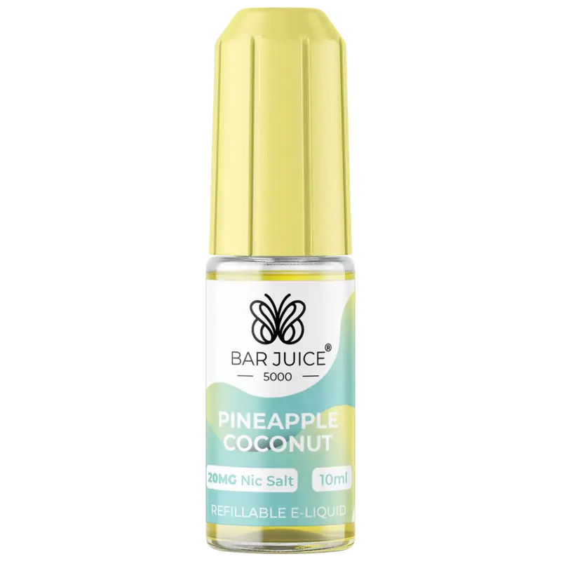 Bar Juice 5000 Pineapple Coconut Nic Salt blends sweet tropical pineapple with smooth creamy coconut for an exotic vape. The bright pineapple inhale is softened by a creamy coconut finish.