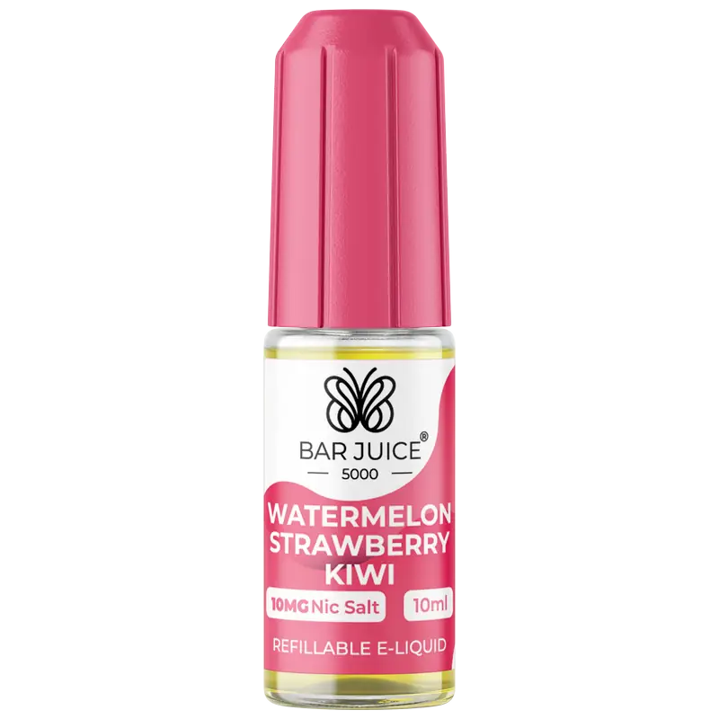 Bar Juice 5000 Watermelon Strawberry Kiwi Nic Salt blends refreshing watermelon with sweet strawberry and tangy kiwi. The tropical fruit mix creates a vibrant and refreshing vape from inhale to exhale.