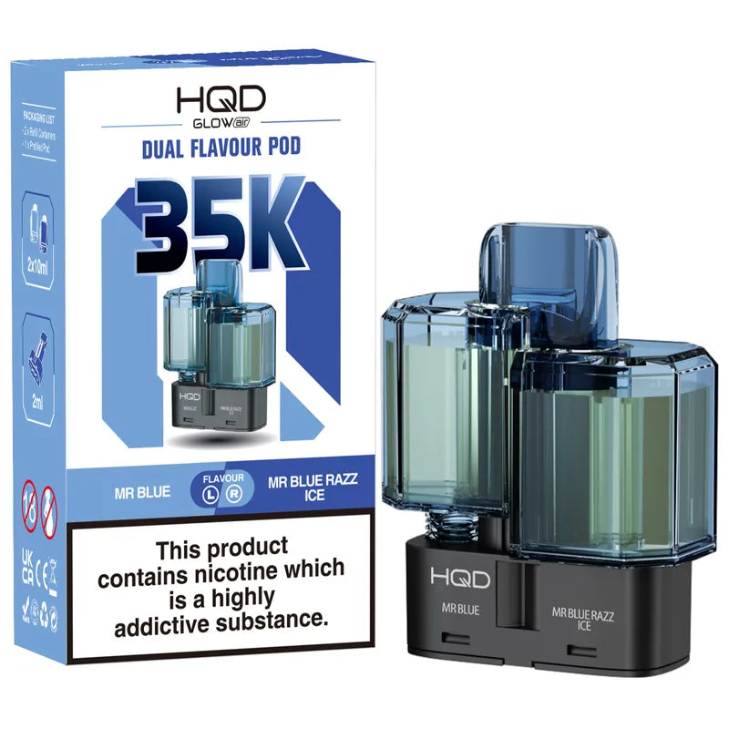 The HQD Glow Air 35K Prefilled Pods are high-capacity replacement pods designed for the HQD Glow Air 70K Kit, built for vapers who want more usage between pod changes and zero mess. Each pod comes preloaded with 22ml of e-liquid (structured as 2ml + 2 × 10ml refill chambers) and delivers up to 35,000 puffs, with TPD-compliant 20mg nicotine for a smooth, satisfying hit. What really makes them stand out is the dual-flavour setup, letting you switch between two flavour profiles without changing pods perfect if you like variety on the go. With 15+ dual-flavour options and mesh coil technology for consistent taste, they’re ideal for everyday UK vaping convenience no refilling, no maintenance, just click-in and vape.