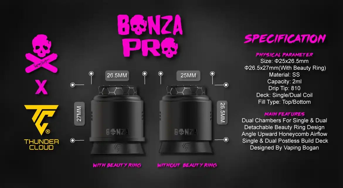 Following the resounding success of the original Bonza series, Vaping Bogan introduces the next generation of rebuildable dripping atomizers: the Bonza Pro RDA. This innovative design combines exceptional performance with sleek aesthetics, delivering an unparalleled vaping experience for all levels of enthusiasts.