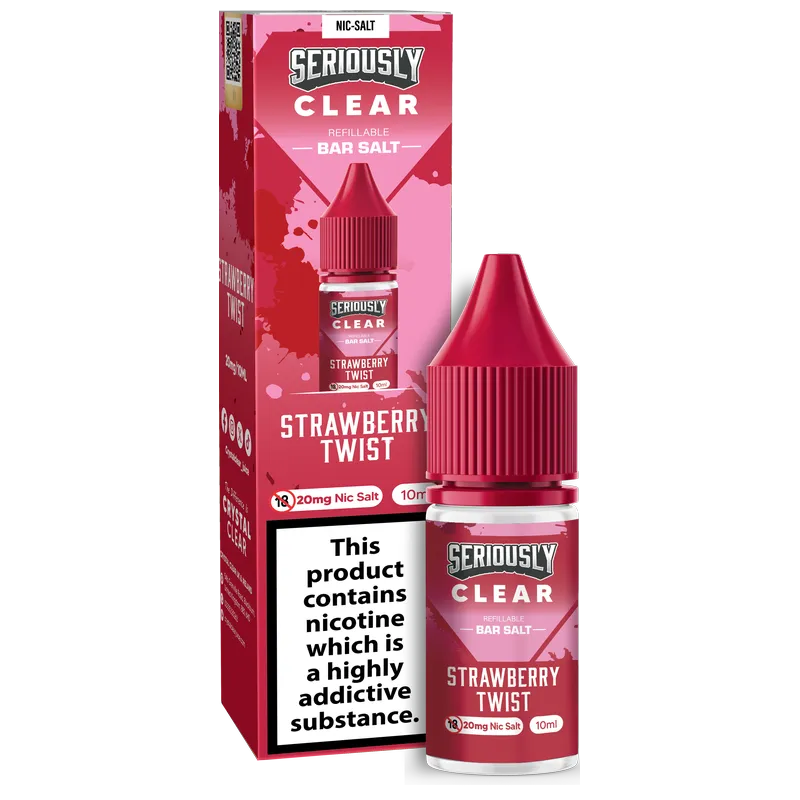 Strawberry Twist nic salt e-liquid by Seriously Clear Bar Salt delivers a bold, disposable-inspired fruit blend with a zesty edge. Sweet, juicy strawberry leads the way, sharpened by sour citrus for a lively, mouth-watering vape. Made for MTL pod kits, it offers quick nicotine satisfaction with a smooth throat hit and clean flavour.
