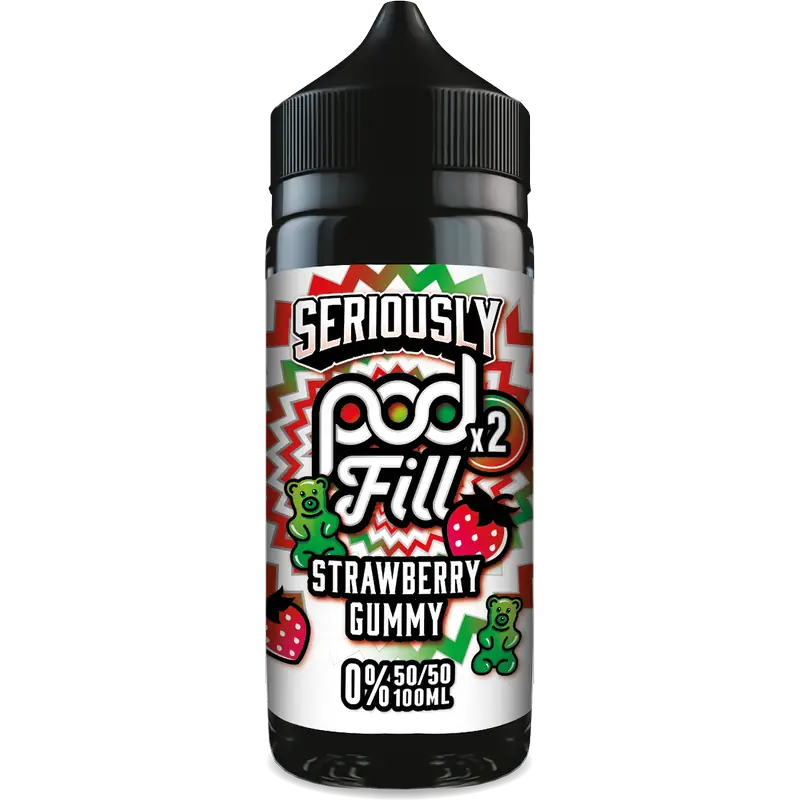 Strawberry Gummy Doozy Seriously Podfill 100ml Shortfill uses a 50 percent VG ratio that enhances flavour richness and smooth vapour. This formulation performs best in pod kits, where the candy sweetness and fruity strawberry notes can develop fully in thick, smooth clouds.