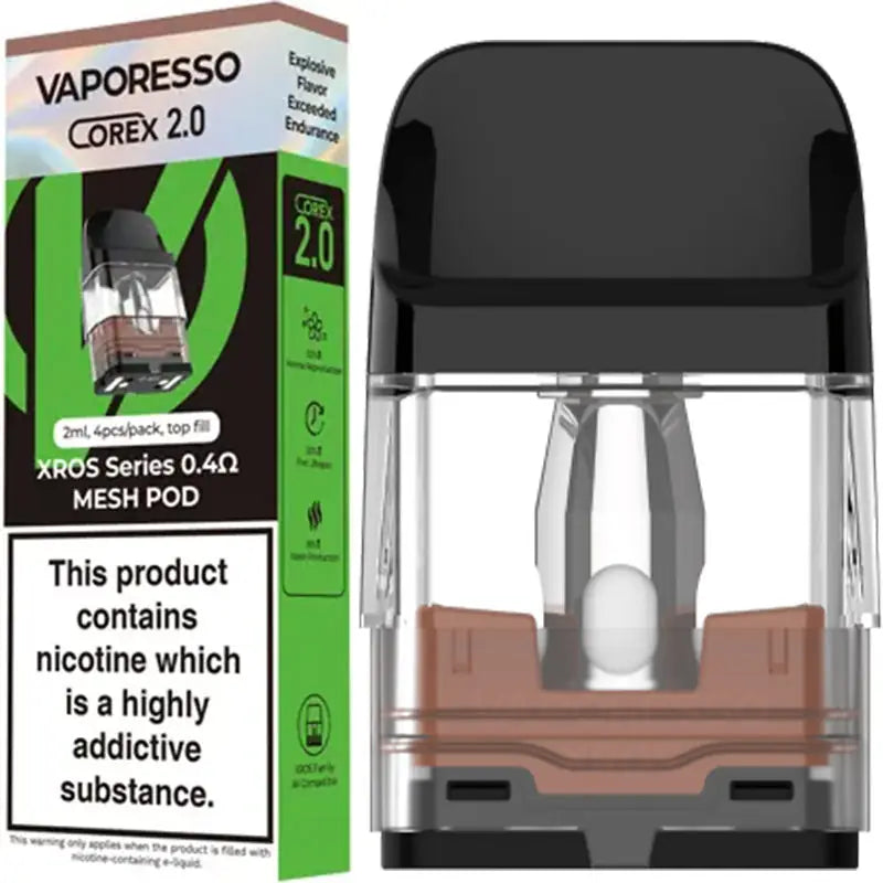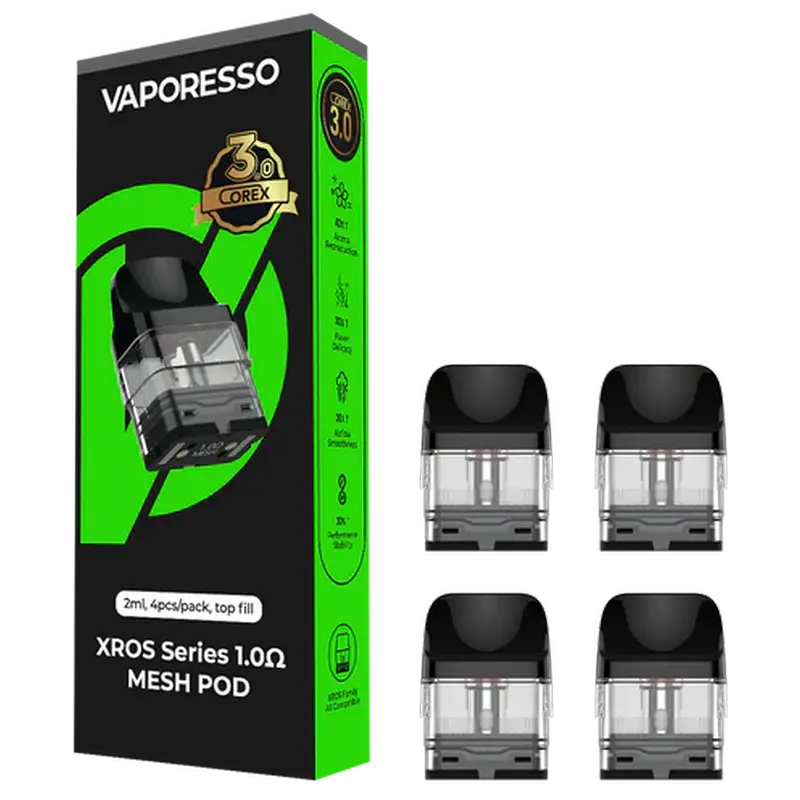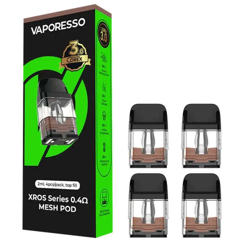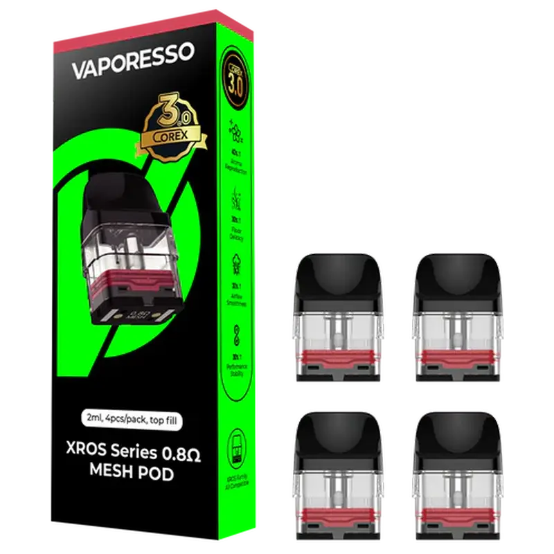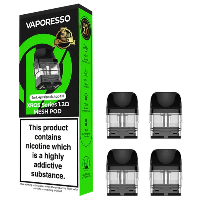 Pods are constructed with eco-friendly PCTG material and a robust quadruple leak-proof design. The 0.4Ω (2ml) pod is specifically designed for XROS 4, XROS 4 Mini, and XROS PRO. All other pods (0.6Ω to 1.2Ω) offer full compatibility with the entire XROS series.